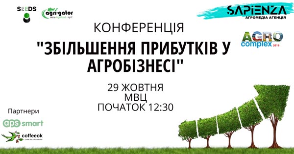 Запрошуємо відвідати Першу конференцію з циклу «Збільшення прибутків в агробізнесі», яка відбудеться 29 жовтня о 12.00 в рамках виставки Agrocоmplex -2019 у Києві (МВЦ, вхід 1А, перший павільйон, 3-й конференц-зал). Організатором виступає агромедіа-агенція SAPIENZA за підтримки Київського Міжнародного Контрактового Ярмарку.