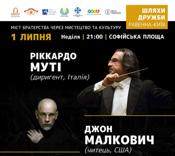 1 липня на Софійській площі Києва та 3 липня в італійському місті Равенна в рамках міжнародного проекту «Шляхи дружби» відбудуться грандіозні концерти під керівництвом найвидатнішого диригента сьогодення Ріккардо Муті (Італія).