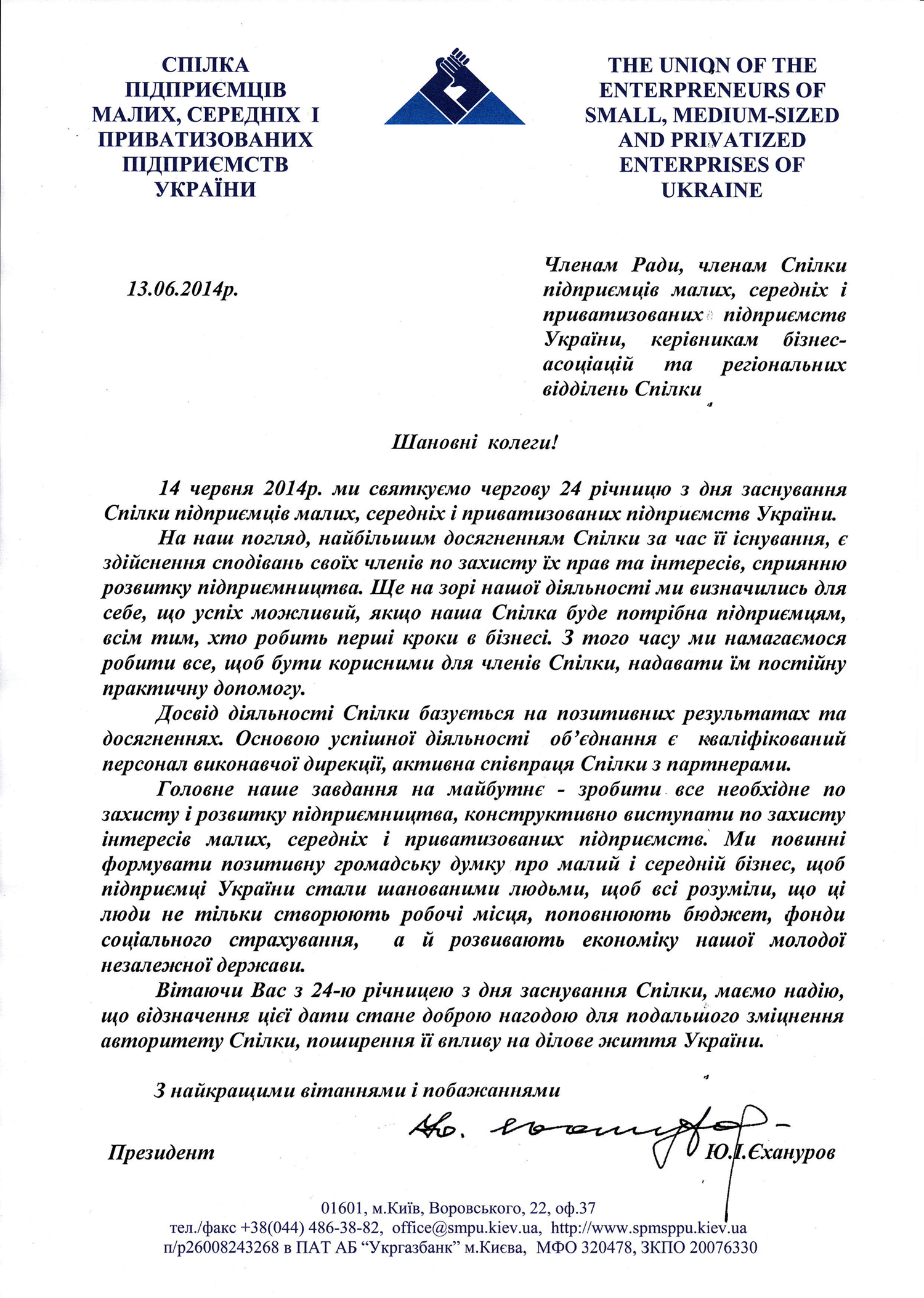 Привітання з нагоди 24 річниці з дня заснування СПМСППУ
