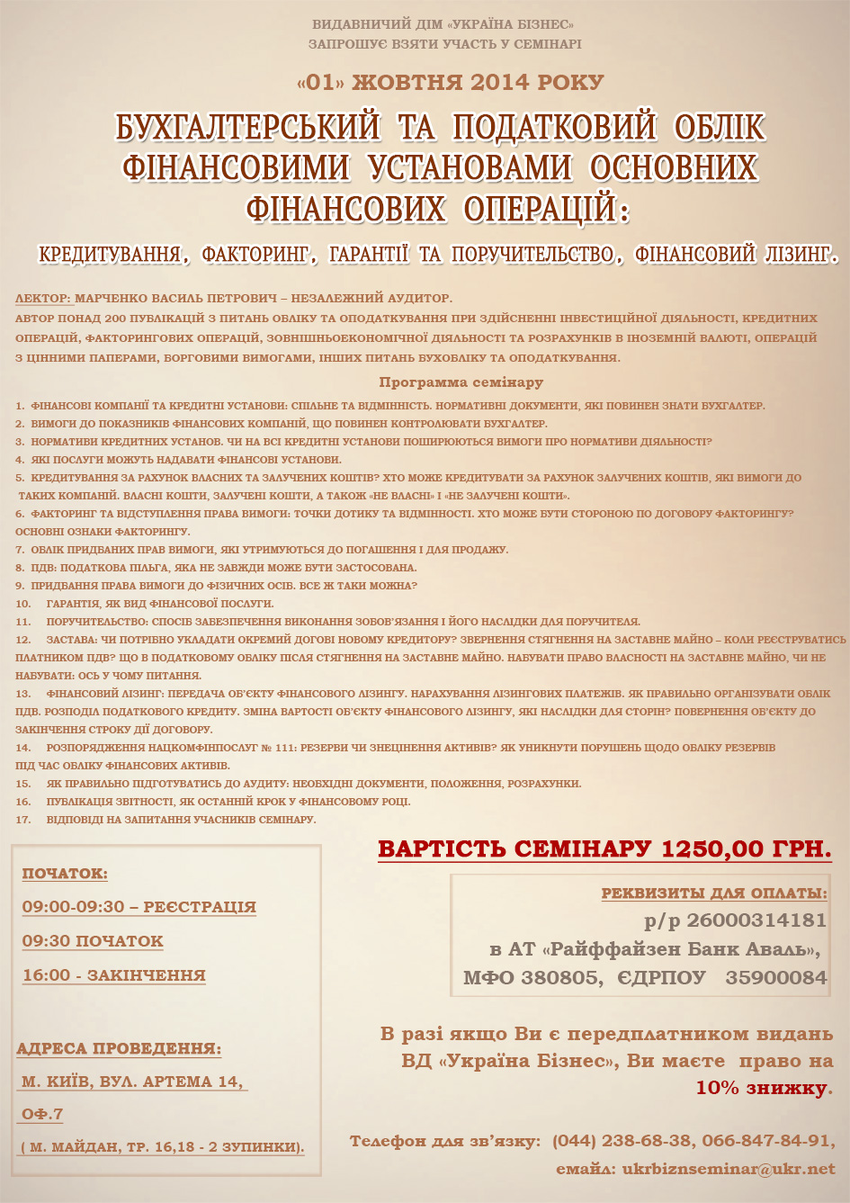 Семінар на тему: Бухгалтерський та податковий облік фінансовими установами основних фінансових операцій