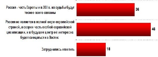 В общественном мнении 46% украинцев Россия не воспринимается в полной мере европейской страной, а скорее выступает как часть особой евразийской цивилизации. Наибольшее число респондентов (63%), которые согласны с этим суждением, проживает на Западе Украины.