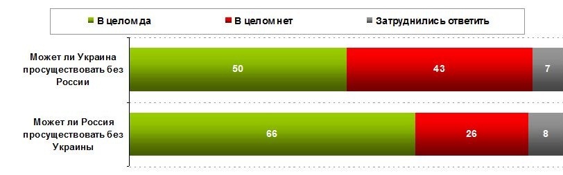 Каждый второй житель Украины, считает, что наша страна в целом сможет просуществовать без России, и еще большее число респондентов 66% считают, что Россия может просуществовать без Украины.