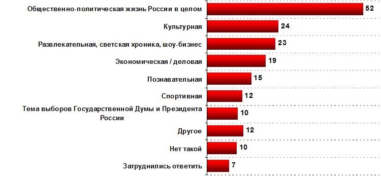 Прежде всего, украинцев интересует в России общественно-политическая жизнь, так утверждает больше половины (52%), от всех ответивших на вопрос. На втором 24% и третьем месте 23%, украинцы интересуются событиями культуры и шоу-бизнеса. Экономической и деловой жизнью России интересуется 19% украинцев.