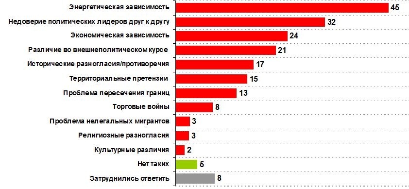 Наиболее серьезными в настоящее время проблемами в отношениях между двумя странами украинцы назвали энергетическую зависимость (45%), недоверие политических лидеров друг к другу (31%) и экономическую зависимость Украины от России (24%). Затем, украинцы среди проблем отмечали различие во внешнеполитическом курсе (21%), исторические разногласия и территориальные претензии (16%), проблему пересечения границ (13%) и проблему торговых войн (8%).