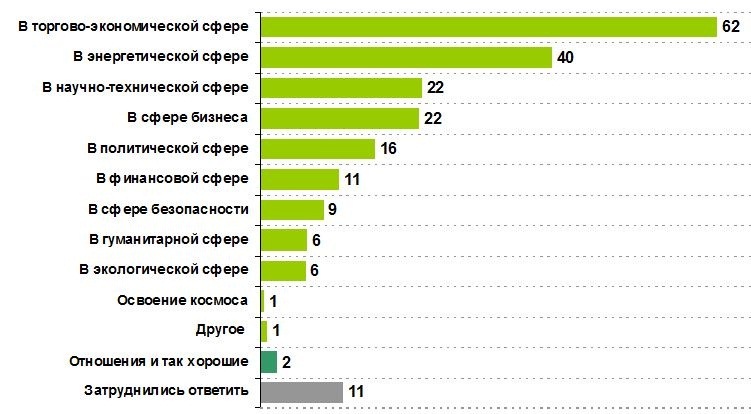 Наиболее перспективными сферами для сотрудничества Украины и России, по мнению украинцев, являются торгово-экономическая сфера (62%), энергетическая сфера (40%), сфера бизнеса (22%). Затем украинцы в порядке предпочтения называли политическую сферу (16%), финансовую сферу (11%) и сферу безопасности (9%).