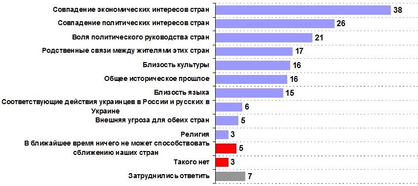 По мнению украинцев в настоящее время больше всего может способствовать сближению Украины и России совпадение экономических интересов (38%), совпадение политических интересов стран (26%), и воля политического руководства двух стран (21%). Затем украинцы указали на наличие родственных связей (17%), близость культуры (16%) и языка (15%), а также общее историческое прошлое (16%).