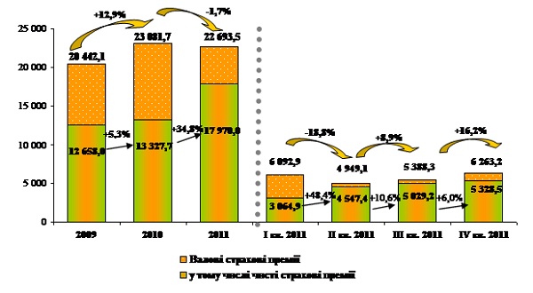 У порівнянні з 2010 роком на 388,2 млн. грн. (-1,7%) зменшились обсяги надходжень валових страхових премій, обсяг чистих страхових премій[2] істотно збільшився на 4 642,3 млн. грн. (+34,8%). Основним фактором зростання чистих страхових премій у порівнянні з 2009 роком стало зменшення обсягу внутрішнього перестрахування на 5 030,4 млн. грн. (-51,6%). При цьому операції з вихідного перестрахування з перестраховиками-нерезидентами у 2011 році в порівнянні з 2012 роком зросли на 191,4 млн. грн. (+19,3%).