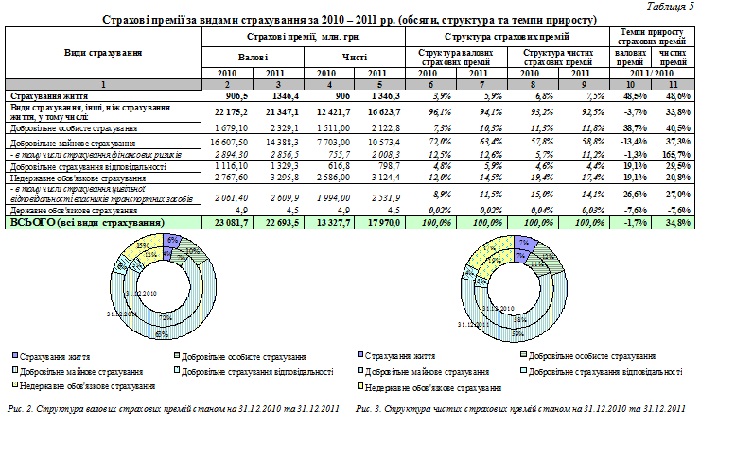 Можна констатувати, що незважаючи на значну кількість компаній, фактично на страховому ринку основну частку валових страхових премій – 92,1% – акумулюють 100 СК "non-Life" (26,5% всіх СК "non-Life") та 95,9% – 20 СК "Life" (31,2% всіх СК "Life"). Страхові премії за видами страхування за 2010 – 2011 рр. (обсяги, структура та темпи приросту) наведено в таблиці 5 та на рис. 2, 3, 4.
