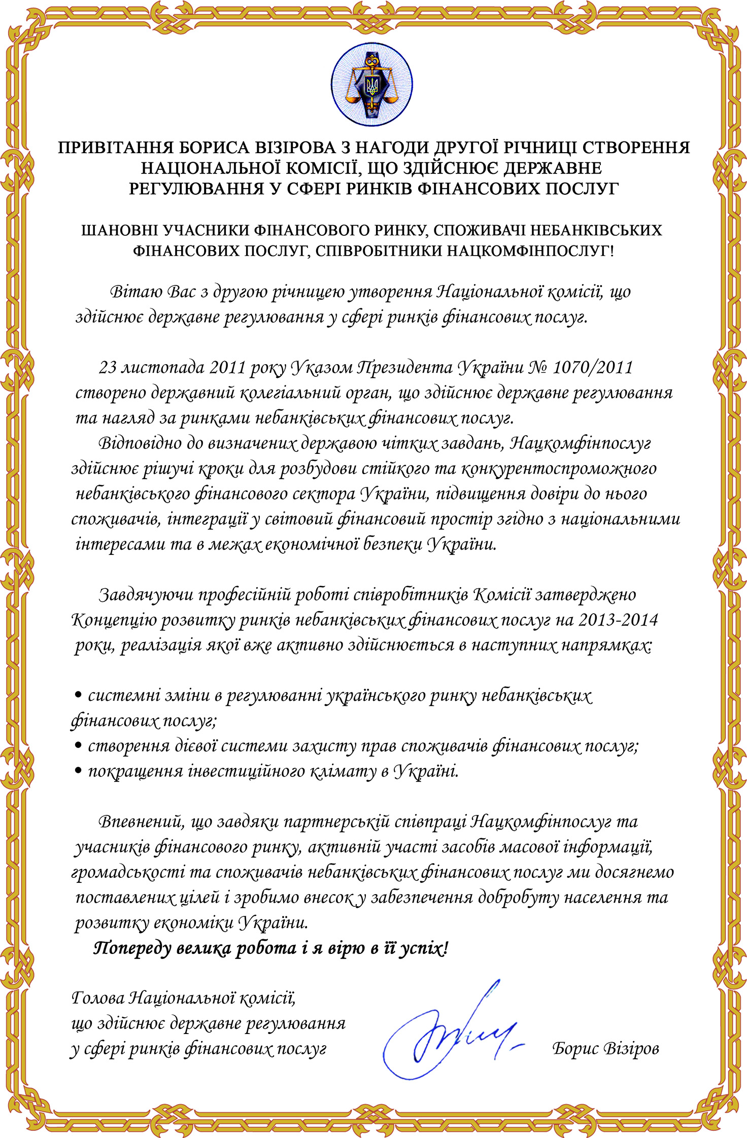 Привітання Бориса Візірова з нагоди другої річниці створення Національної комісії, що здійснює державне регулювання у сфері ринків фінансових послуг