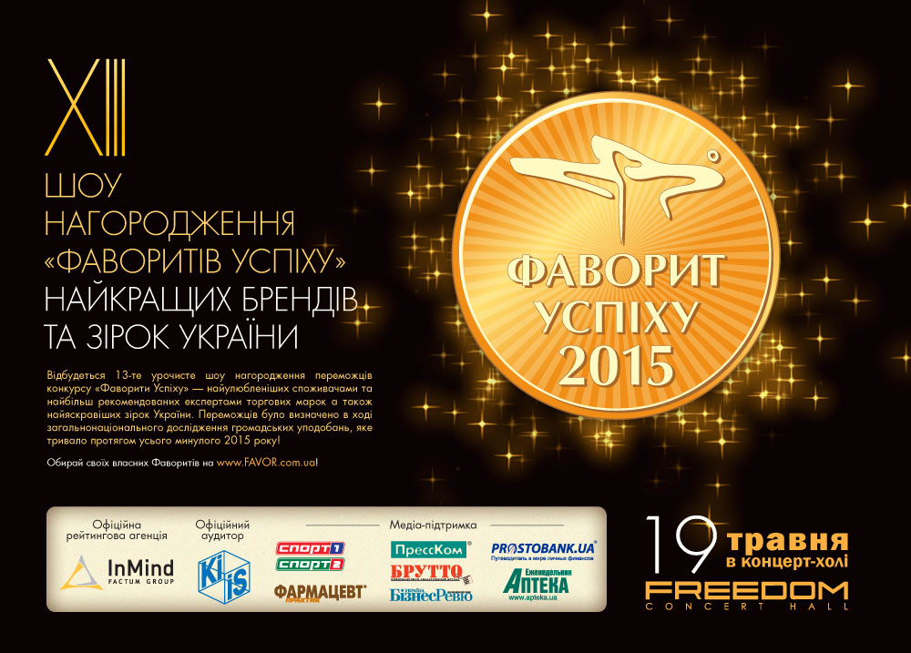 19 мая 2016 года в концерт-холле «FreeДом» состоится XIII торжественная церемония награждения победителей открытого рейтинга потребительских предпочтений «Фавориты Успеха» в Украине.