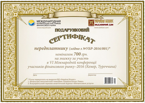 При условии годовой подписки-2016 на еженедельник «Украина Бизнес Ревю» и журнал «Финансовые услуги» СЕРТИФИКАТ НА СКИДКУ дает возможность каждому участнику Конференции получить скидку номиналом 700 гривен на участие в Международной конференции, которая пройдет в 2016 году в Турции (г. Кемер).
